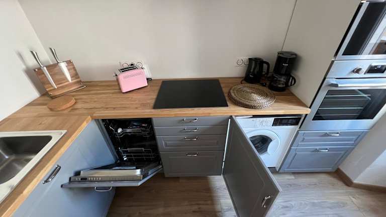 Die Ferienwohnung verfügt über ein Schlafzimmer, ein Wohnzimmer und eine voll ausgestattete Küche mit Kühlschrank und Kaffeemaschine. Zudem gibt es ein Badezimmer mit Dusche und kostenlosen Pflegeprodukten. Auf Anfrage können Handtücher und Bettwäsche gegen Aufpreis bereitgestellt werden. Es steht ein Raum für Erwachsene sowie ein Zimmer mit einem Hochbett zur Verfügung. Bitte beachten Sie, dass für die Nutzung des zweiten Zimmers zusätzliche Gebühren anfallen.