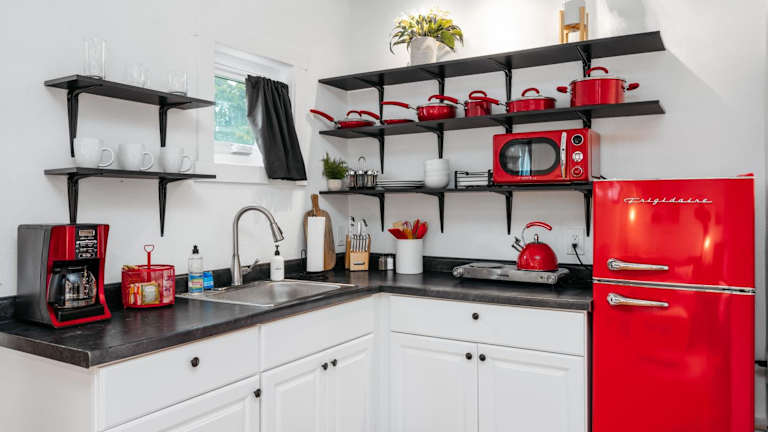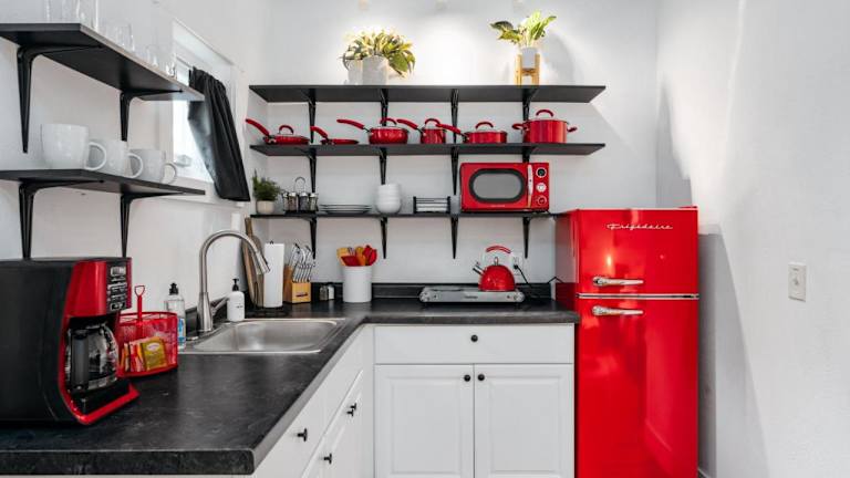 In der Küchenzeile stehen ein Kühlschrank, eine Mikrowelle, eine Herdplatte, eine Kaffeemaschine und ein Wasserkocher zur Verfügung.