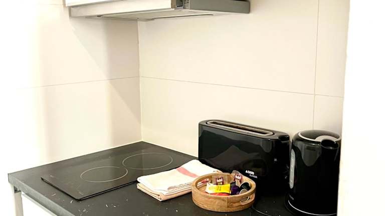 Die Ferienwohnung umfasst 1 Schlafzimmer, ein Wohnzimmer und eine voll ausgestattete Küche mit Kühlschrank und Kaffeemaschine. Ein Badezimmer mit Dusche und Haartrockner ist ebenfalls vorhanden. Handtücher und Bettwäsche werden bereitgestellt.