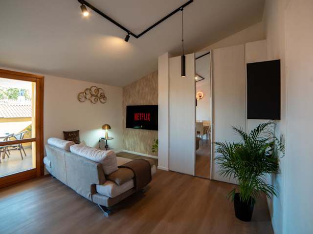 Die Ferienwohnung umfasst 1 Schlafzimmer und verfügt über einen Balkon sowie eine Terrasse mit Stadtblick. Zur Ausstattung gehören ein Flachbild-TV und eine gut ausgestattete Küche, die mit einem Kühlschrank, einem Geschirrspüler und einem Ofen ausgestattet ist. Des Weiteren bietet die Unterkunft ein Badezimmer mit einer Dusche und einem Haartrockner. WLAN und Internetverbindung sind in der gesamten Unterkunft kostenfrei verfügbar.