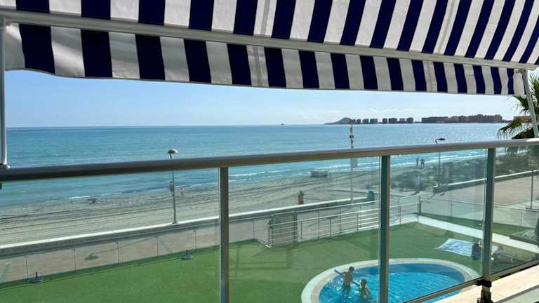 LA MANGA MAR MENOR - Urb MAR AZUL, 2, Primer piso 1B bietet eine Ferienwohnung mit kostenlosem WLAN und Meerblick. Die Unterkunft umfasst einen saisonalen Außenpool, einen eigenen Strandbereich und eine Sonnenterrasse. Die Ferienwohnung wird von einem privaten Gastgeber geführt und es sind keine Festlichkeiten wie Junggesellenabschiede gestattet.