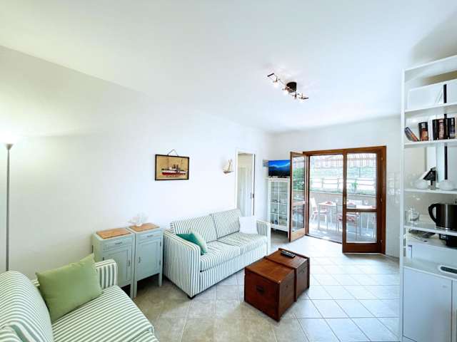 Die klimatisierte Ferienwohnung besteht aus 1 Schlafzimmer, einem Wohnzimmer und einer voll ausgestatteten Küche mit Kühlschrank und Kaffeemaschine. Das Badezimmer ist mit Bidet und Dusche ausgestattet. Auf Anfrage können Handtücher und Bettwäsche gegen Aufpreis bereitgestellt werden.