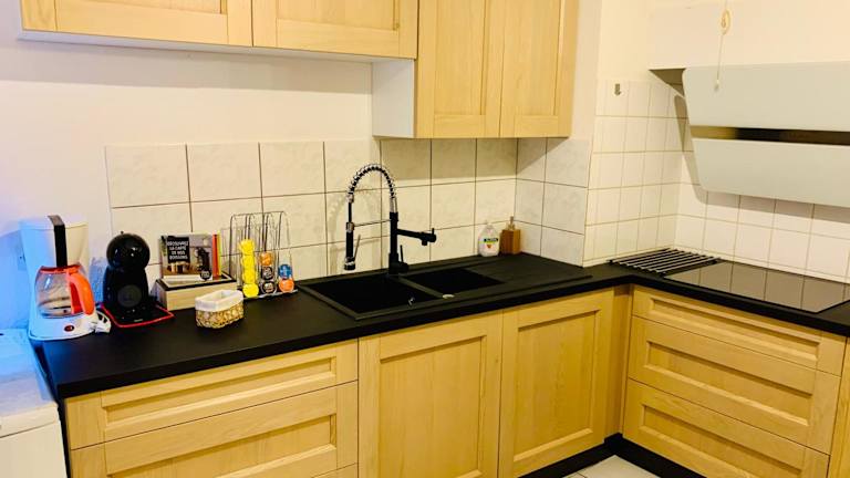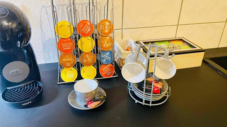 Die Ferienwohnung besteht aus einem Schlafzimmer, einem Wohnzimmer und einer voll ausgestatteten Küche, die mit einem Kühlschrank und einer Kaffeemaschine ausgestattet ist. Außerdem verfügt die Unterkunft über ein Badezimmer mit Dusche und Haartrockner. Handtücher und Bettwäsche sind ebenfalls vorhanden.
