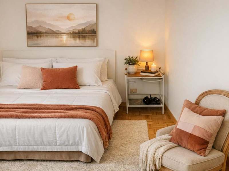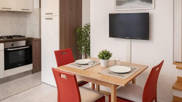 Das Apartment umfasst ein Schlafzimmer, ein Wohnzimmer sowie eine gut ausgestattete Küche mit Kühlschrank und Ofen. Es sind außerdem 2 Badezimmer mit Bidet vorhanden. Handtücher und Bettwäsche werden bereitgestellt.
