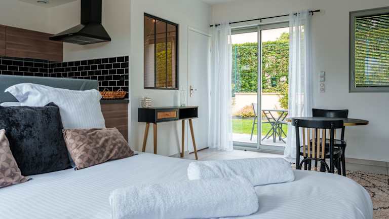 Die Zimmer sind mit einem Sitzbereich, einem Satelliten-Flachbild-TV und einer voll ausgestatteten Küche mit Kühlschrank, Ofen, Mikrowelle, Herdplatte, Toaster, Kaffeemaschine und Wasserkocher ausgestattet. Jedes Zimmer verfügt über ein eigenes Badezimmer mit Dusche und kostenlosen Pflegeprodukten. Zudem bieten die Zimmer Gartenblick und sind schallisoliert.