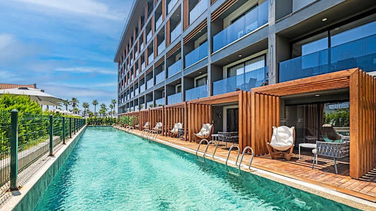 Das Lago Hotel liegt direkt am Strand von Titreyengol in Side. Das Hotel bietet einen hoteleigenen 350 m Sand-/Kiesstrand und einen Steg/Badeplattform. In der Umgebung gibt es Einkaufsmöglichkeiten, Restaurants/Bars und Unterhaltungsmöglichkeiten. Das Stadt-/Ortszentrum von Side liegt etwa 9 km entfernt und der Flughafen Antalya ist ca. 75 km entfernt.