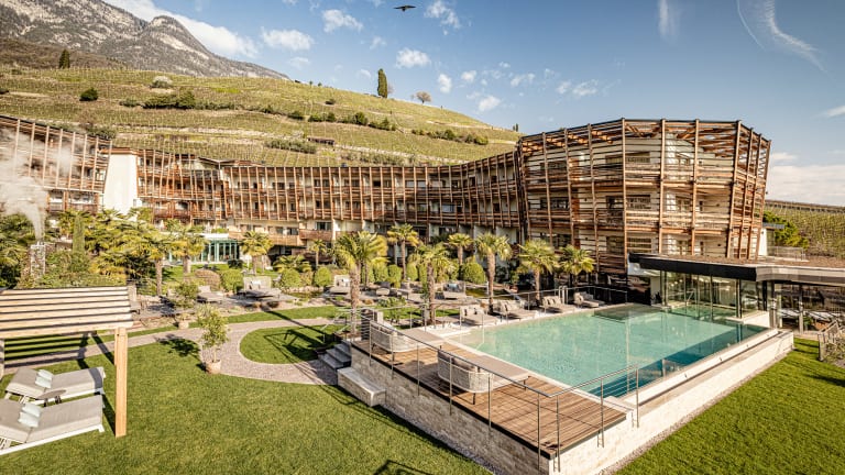 Mittendrin im süßen Süden. Zwischen Weinbergen und Palmen befindet sich das Lake Spa Hotel SEELEITEN fünf Gehminuten vom Kalterer See entfernt.