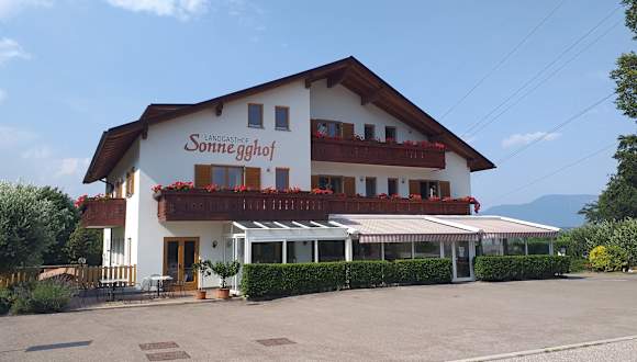 Der Sonnegghof liegt in Altenburg inmitten von Obstgärten und Weinbergen. Gäste schätzen die ruhige Lage direkt am Wald, oberhalb des Kalterer Sees. Das Dorfzentrum von Kaltern befindet sich in sieben Kilometern Entfernung. Die zwölf gemütlich eingerichteten Doppelzimmer sind mit Dusche oder Bad, Sat-TV sowie größtenteils mit Balkon ausgestattet. Ein Fahrstuhl und ein behindertengerecht eingerichtetes Badezimmer stehen zur Verfügung. Das reichhaltige Frühstück wird im modern eingerichteten Frühstücksraum oder in der rustikalen Hausbar eingenommen. Mittags und abends werden neben hausgemachten regionalen Spezialitäten auch nationale und internationale Küchengerichte serviert. Gerne wird auf die kulinarischen Wünsche von Vegetariern, Veganern und Allergikern sowie von Kindern eingegangen. Als Begleitung zu den Gerichten stehen neben alkoholfreien Getränken und Bier vom Fass auch der Kalterer Schankwein sowie eine erlesene Auswahl an Weinflaschen bekannter Südtiroler Produzenten und Kellereien zur Verfügung. Die Inklusivleistungen beinhalten WLAN, hauseigene Fahrräder und Autoparkplätze sowie Abstellplätze bzw. Garagenstellplätze für Motor- und Fahrräder.