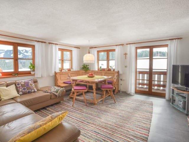 Die komfortable Ferienwohnung ist ebenerdig begehbar, ohne Stufen und Schwellen. Unseren Gästen stehen 130 qm Wohnfläche zur Verfügung. Die im Landhausstil eingerichtete Wohnung bietet ein großzügiges Wohnzimmer mit SAT-TV und Stereoanlage, gemütlicher Sitzecke und einer großen Ledercouch. Die Küche mit Essecke und Spülmaschine, Wasserkocher, Vierplattenherd mit Backofen, Kaffemaschine, Toaster, Mixer etc. ist mehr als zweckmäßig ausgestattet. In dieser Küche mit Bergblick auch das Kochen Spaß. Morgens gibt es keine Staus, da in der Wohnung einmal ein Bad mit kombinierter Dusche, eine Dusche mit WC und ein weiteres separates WC zur Verfügung stehen. Die Schlafzimmer verfügen über einen wohnlichen Holzboden (Lärche) und zusätzlich teilweise eigene Waschbecken. Ein viertes Schlafzimmer mit einer hochwertigen Schlafcouch (durchgehende Matratze) lässt auch die 7. und 8. Person erholsam schlafen. Zwei Reisebettchen und Hochstühle gehören zum Standard. Alle Zimmer verfügen über Berg- und Wiesenblick, Wohnzimmer und die drei Doppelzimmer über Südbalkon bzw. verglaste Loggia.