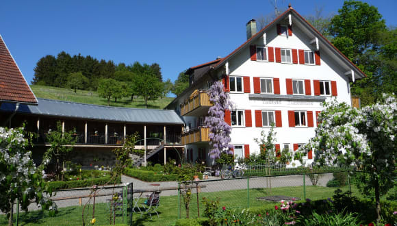 Wir befinden uns in einer idyllischen Einzellage am Nonnenbach, umgeben von Wiesen, Obstbäumen und Wald.