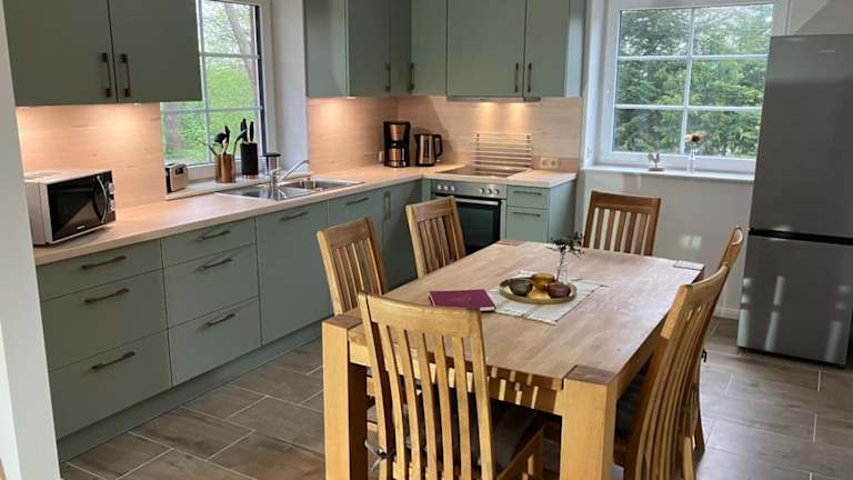 Das Ferienhaus umfasst zwei Schlafzimmer und bietet einen TV mit Satellitenkanälen. Die voll ausgestattete Küche verfügt über einen Kühlschrank, einen Geschirrspüler, eine Waschmaschine, einen Ofen sowie eine Mikrowelle.