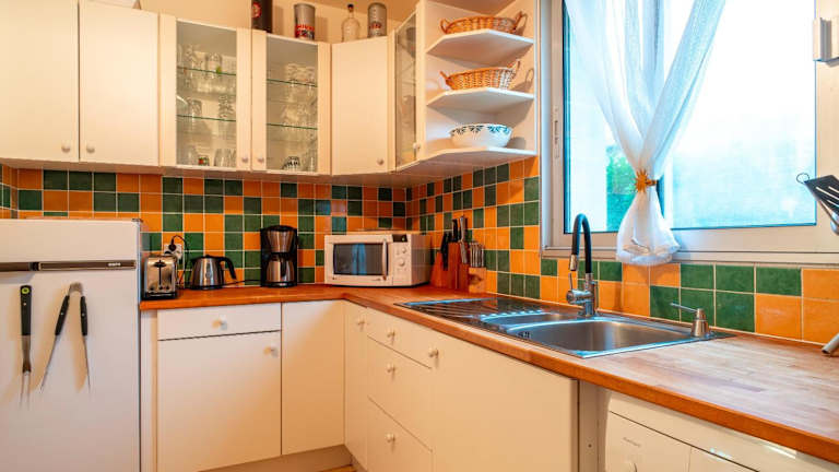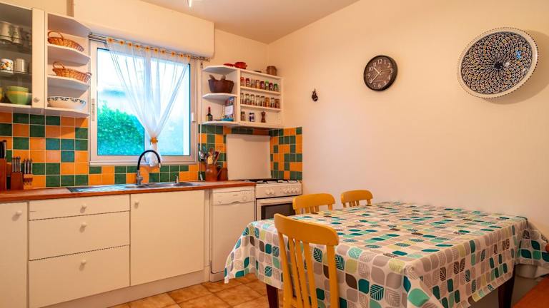 Die Unterkunft beinhaltet eine gut ausgestattete Küche mit einem Kühlschrank und einem Geschirrspüler, die die Zubereitung eigener Mahlzeiten ermöglicht.