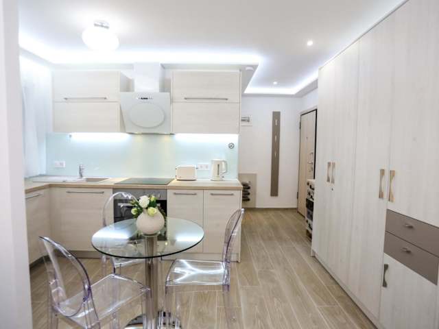 Die Ferienwohnung verfügt über ein Schlafzimmer, einen Flachbild-TV, einen Essbereich sowie eine Küche mit einem Kühlschrank und einem Geschirrspüler. Handtücher und Bettwäsche werden zur Verfügung gestellt.