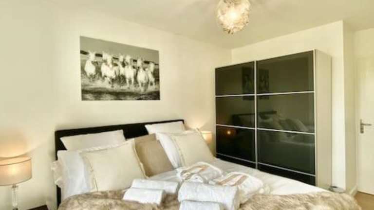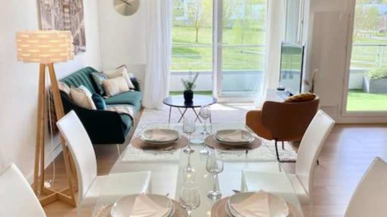 Die Ferienwohnung bietet zwei Schlafzimmer, ein Badezimmer sowie einen Essbereich. Die Ausstattung umfasst Bettwäsche, Handtücher, einen Flachbild-TV und eine voll ausgestattete Küche. Es gibt außerdem eine Terrasse, von der aus die Gäste den Blick auf den Garten genießen können.