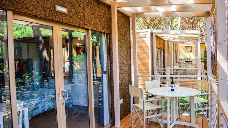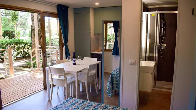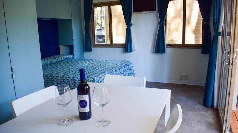 Die klimatisierten Mobilheime verfügen über eine möblierte Veranda, eine komplett ausgestattete Küchenzeile und ein Bad mit Dusche. Bettwäsche und Handtücher können entweder selbst mitgebracht oder in der Unterkunft gemietet werden.