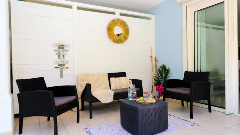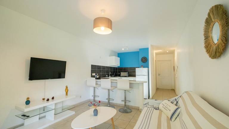 Die Ferienwohnung verfügt über eine Klimaanlage und besteht aus einem Schlafzimmer, einem Wohnzimmer sowie einer voll ausgestatteten Küche mit Kühlschrank und Kaffeemaschine. Ein Badezimmer mit Dusche ist vorhanden. Handtücher und Bettwäsche werden bereitgestellt.