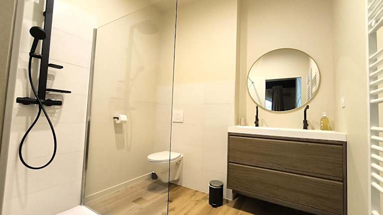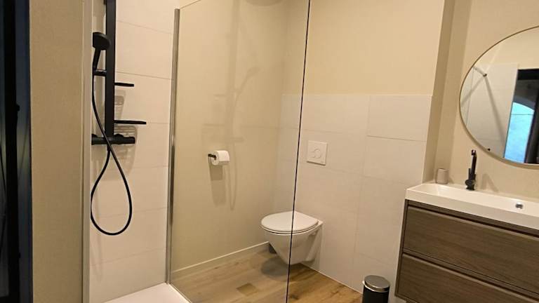 Die Ferienwohnung besteht aus einem Schlafzimmer und einem Wohnzimmer. Sie bietet ein modernes Badezimmer mit Dusche und Haartrockner. Handtücher und Bettwäsche werden bereitgestellt.