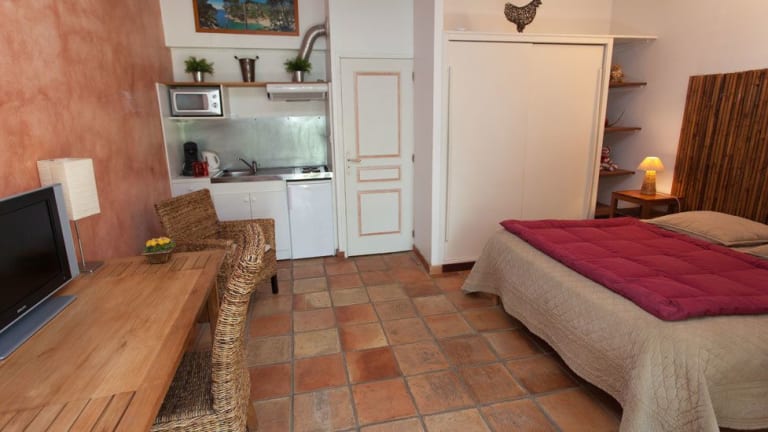 Die Zimmer im Le Mas de Bertagne sind gemütlich eingerichtet und verfügen über einen eigenen Eingang sowie eine Terrasse mit Blick auf den Garten. Zur Ausstattung gehören ein Flachbild-TV, ein eigenes Bad und Klimaanlage. Einige Zimmer sind mit einer praktischen Küchenzeile ausgestattet, die eine Mikrowelle, ein Kochfeld und einen Kühlschrank umfasst.