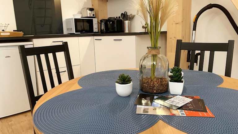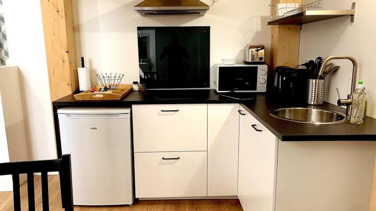 In der Unterkunft steht eine voll ausgestattete Küche zur Verfügung, die mit einem Kühlschrank, einer Mikrowelle, einer Herdplatte, einer Kaffeemaschine und einem Wasserkocher ausgestattet ist. Ein Esstisch ist ebenfalls vorhanden.