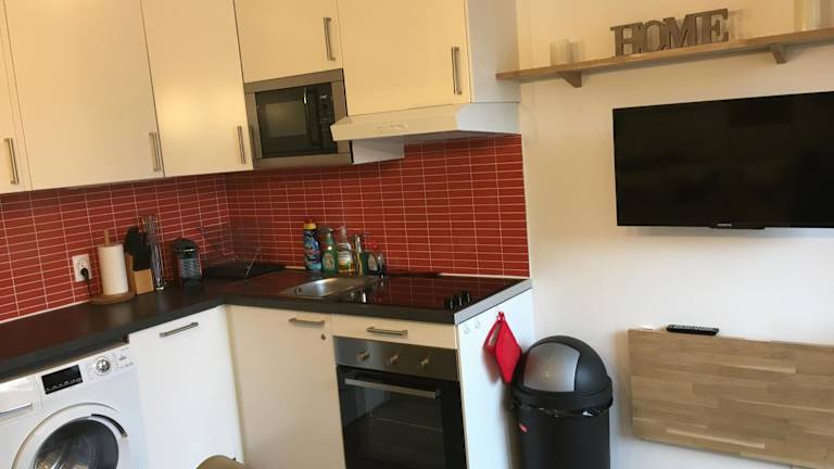 Das Apartment bietet eine Selbstversorgungsmöglichkeit mit einer voll ausgestatteten Küche. In der Umgebung finden Sie jedoch auch Restaurants und Cafés, in denen Sie lokale und internationale Küche genießen können.