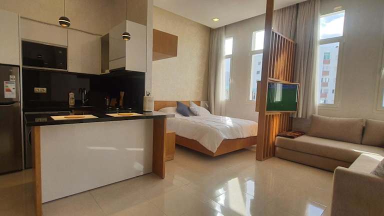 Die Ferienwohnung umfasst ein separates Schlafzimmer, ein Wohnzimmer, eine voll ausgestattete Küche sowie ein Badezimmer. Zur Ausstattung gehört zudem ein Flachbild-TV.