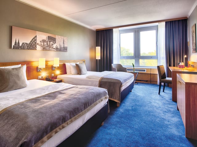 Das Leonardo Hotel Köln Bonn Airport verfügt auf insgesamt 6 Etagen über 19 Doppel-, 78 Twinbed-, und 80 Einzelzimmer in unterschiedlichen Kategorien ( z.B. Standard- oder Komfortkategorie). Ferner finden unsere Gäste 6 komplette Nichtraucher-Etagen sowie behindertengerechte Zimmer vor. Einzel- wie Doppelzimmer verfügen über: Bad/WC, Klimaanlage, Sat-TV, Pay-TV, Radio, Modemanschluss, LAN- Internetzugang, Schreibtisch, separate Sitzgelegenheit, Couchtisch und Telefon.