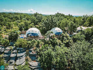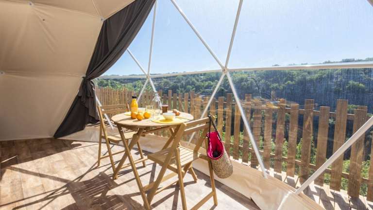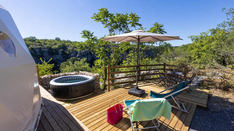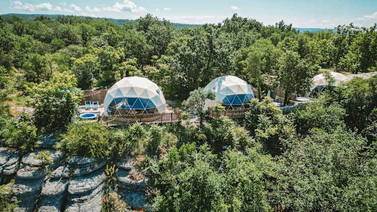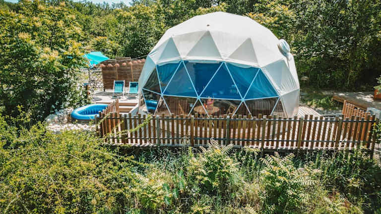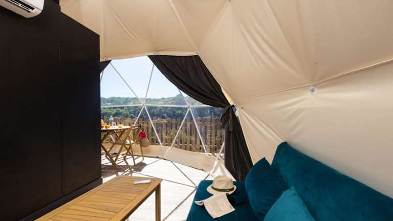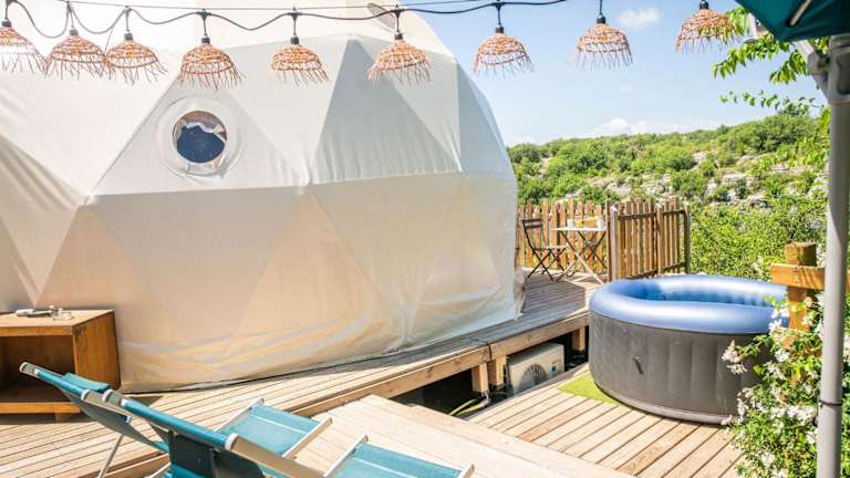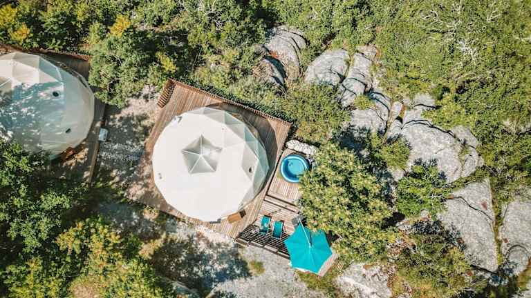 Die Unterkunft Les Dômes des Gorges befindet sich in Ruoms und liegt 15 km von der Felsbrücke Pont d'Arc sowie 17 km von der Schlucht Gorges de l’Ardèche entfernt. In der Nähe befinden sich auch die Chauvet-Höhle (15 km) und Paiolive Wood (19 km). Der Flughafen Nîmes-Alès-Camargue-Cévennes ist 109 km entfernt.
