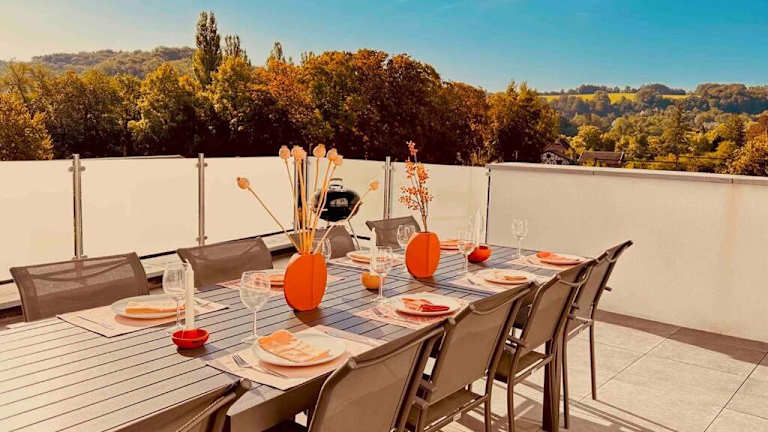 Les terrasses de la vallée - Esneux (Liège) bietet Übernachtungsmöglichkeiten in einem Ferienhaus mit Balkon und kostenlosem WLAN. Die klimatisierte Unterkunft verfügt über 4 Schlafzimmer, eine Terrasse und kostenlosen Privatparkplatz.
