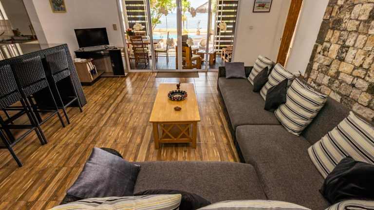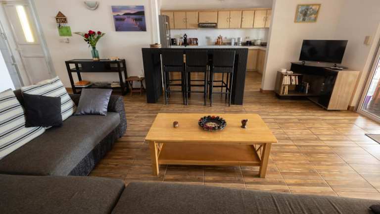 Die Villa verfügt über 3 Schlafzimmer und 2 Badezimmer, die alle modern und komfortabel eingerichtet sind. Die Zimmer sind mit Bettwäsche und Handtüchern ausgestattet und verfügen über einen Flachbild-TV. Der Essbereich bietet ausreichend Platz für gemeinsame Mahlzeiten, während die voll ausgestattete Küche Ihnen die Möglichkeit gibt, Ihre eigenen Gerichte zuzubereiten. Die Villa verfügt auch über eine Terrasse mit Meerblick, auf der Sie die frische Meeresbrise und den Ausblick genießen können.