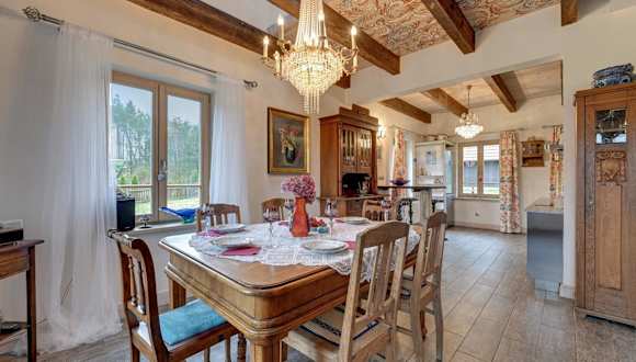 Leśny Dworek Sominy - Dom z Sauną i Kominkiem bietet Übernachtungsmöglichkeiten in einer Villa mit Zugang zu einer Sauna. Die Villa verfügt über einen Garten, Grillmöglichkeiten sowie kostenloses WLAN. Zudem gibt es eine Gemeinschaftslounge und eine Terrasse mit Gartenblick.