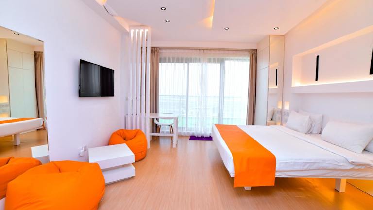 Die Unterkunft befindet sich in Ra’s al-Chaima, in unmittelbarer Nähe des eigenen Strandbereichs. Der Turtle Beach ist 2,1 km entfernt und der Santorini Beach liegt 2,2 km entfernt. Das Einkaufszentrum Al Hamra Mall ist in einer Entfernung von 10 km erreichbar. Der Flughafen Ras Al Khaimah ist etwa 31 km von der Unterkunft entfernt.