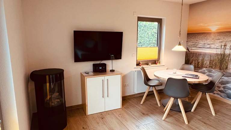 Die Ferienwohnung ist mit einer gut ausgestatteten Küche mit Kühlschrank und Geschirrspüler versehen, was Selbstverpflegung ermöglicht. Zusätzliche Verpflegungsmöglichkeiten sind nicht näher beschrieben.