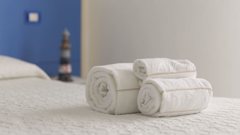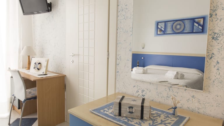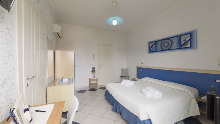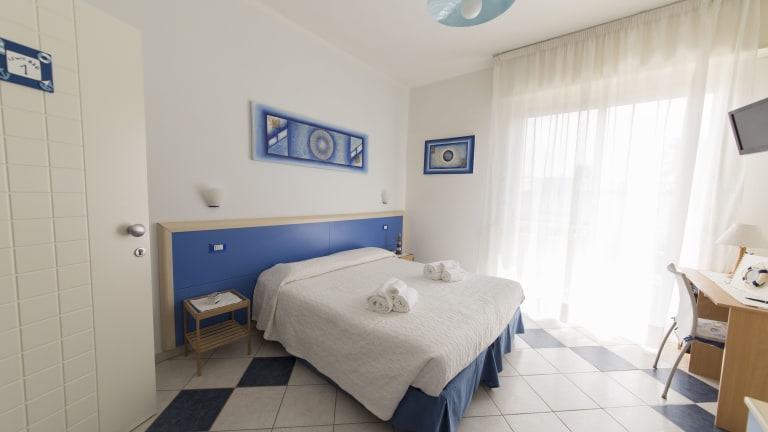 Die Zimmer sind in Blau- und Weißtönen gehalten und mit Fliesenböden ausgestattet. Jedes Zimmer verfügt über einen Flachbild-TV, eine Minibar und ein eigenes Bad mit Pflegeprodukten. Reinigung und Wechsel der Bettwäsche sowie Handtücher erfolgen alle drei Nächte, zusätzliche Reinigungen sind auf Anfrage und gegen Aufpreis verfügbar.