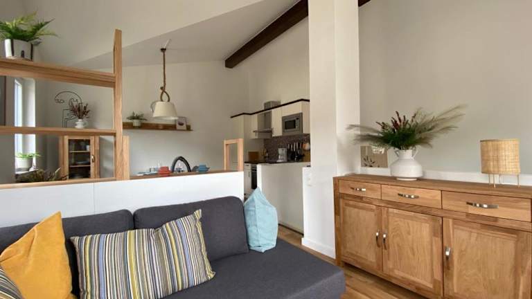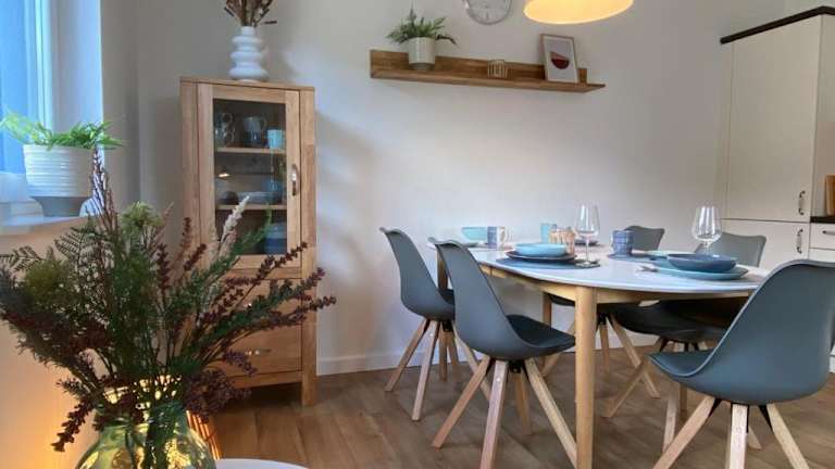 Die Ferienwohnung ist mit einer voll ausgestatteten Küche versehen, die einen Kühlschrank und einen Geschirrspüler beinhaltet. Es sind keine speziellen Verpflegungsoptionen oder gastronomischen Dienstleistungen erwähnt.
