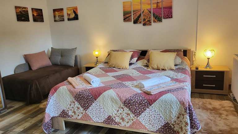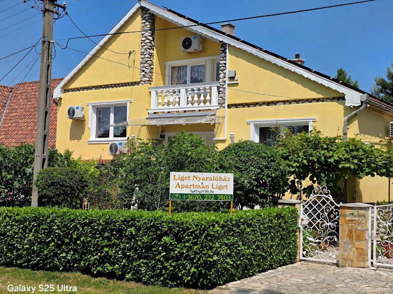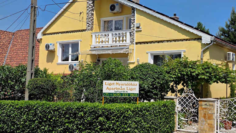 Liget Nyaralóház és Apartman Liget ist eine Unterkunft mit einem Garten, einer Gemeinschaftslounge und einer Terrasse. Sie bietet Übernachtungsmöglichkeiten mit Klimaanlage und modernen Annehmlichkeiten. Vor Ort sind sowohl WLAN als auch Privatparkplätze ohne zusätzliche Kosten verfügbar. Die Unterkunft wird von einem privaten Gastgeber geführt, und der Check-in ist ab 15:00 bis 21:00 Uhr möglich.