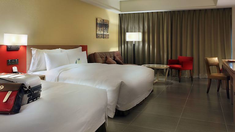 Die Zimmer sind klimatisiert und verfügen über ein Doppelbett sowie ein Sofabett. Es sind auch Baby- und Zustellbetten verfügbar. Die Ausstattung umfasst einen Safe, eine Minibar, einen Schreibtisch, einen Kühlschrank und eine Tee-/Kaffeemaschine. Technische Annehmlichkeiten wie ein Telefon, ein TV-Gerät und WLAN stehen bereit. Im Badezimmer befinden sich eine Dusche und eine Badewanne sowie ein Haartrockner und Kosmetikartikel.