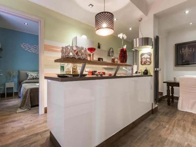 Die Ferienwohnung verfügt über ein Schlafzimmer und ein Badezimmer mit Bidet, Dusche und Haartrockner. Die Küchenzeile ist ausgestattet mit Kühlschrank, Mikrowelle, Herdplatte, Kaffeemaschine und Wasserkocher. Zudem sind Klimaanlage und eine Veranda/Patiobereich vorhanden.