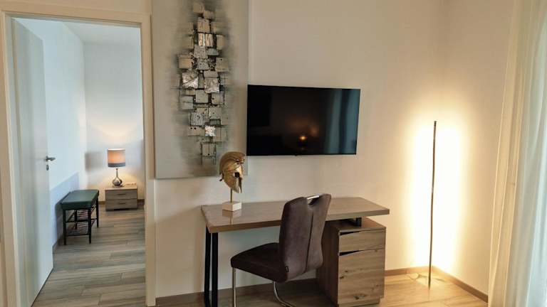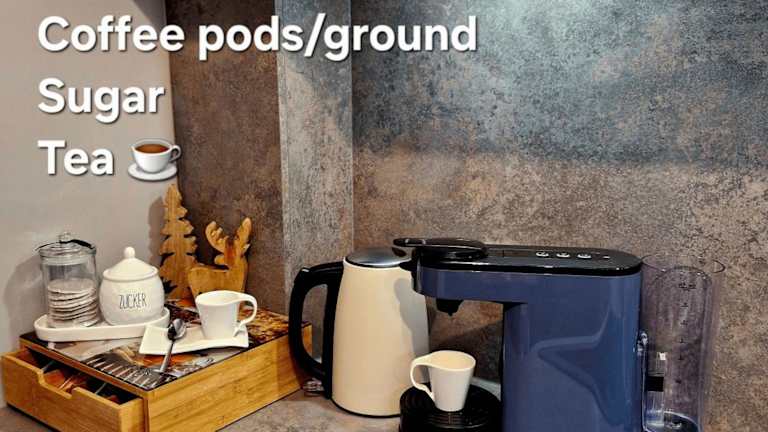 Die Ferienwohnung umfasst ein Schlafzimmer, ein Wohnzimmer sowie eine voll ausgestattete Küche mit Kühlschrank und Kaffeemaschine. Zudem verfügt sie über ein Badezimmer mit Dusche und kostenlosen Pflegeprodukten. Handtücher und Bettwäsche werden bereitgestellt.