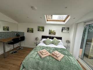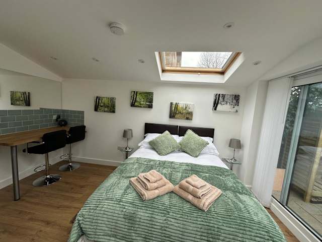 Die Ferienwohnung bietet 1 Schlafzimmer und 1 Badezimmer. Zur Ausstattung gehören Bettwäsche, Handtücher, ein Flachbild-TV, ein Essbereich sowie eine voll ausgestattete Küche. Die Terrasse ermöglicht einen Blick auf den Garten.