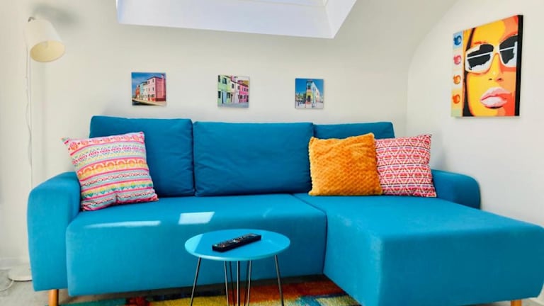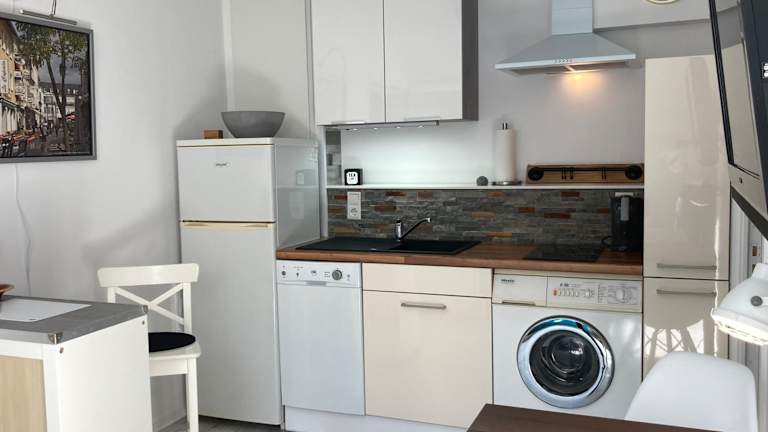 Das Apartment bietet ein komfortables Schlafzimmer mit einem Boxspringbett, ein gemütliches Wohnzimmer, eine voll ausgestattete Küche mit Kühlschrank und Kaffeemaschine sowie ein Badezimmer mit Dusche und kostenlosen Pflegeprodukten. Handtücher und Bettwäsche werden gestellt. WLAN ist kostenlos verfügbar.