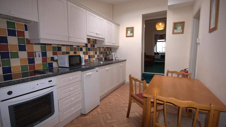 Die Ferienwohnung verfügt über ein Wohnzimmer mit einem Flachbild-TV und eine voll ausgestattete Küche, die den Gästen eine komfortable Selbstversorgung ermöglicht.