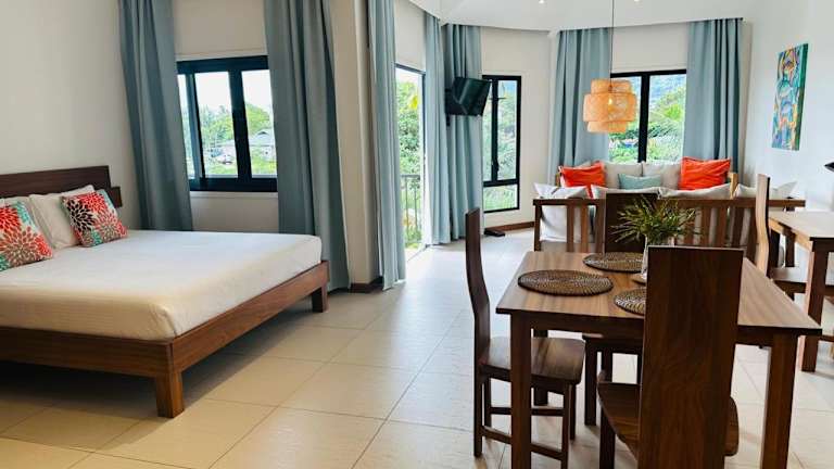Die Lodoicea Apartments bieten klimatisierte Unterkünfte mit kostenfreiem WLAN. Jedes Apartment verfügt über einen Balkon mit Gartenblick, einen gemütlichen Sitzbereich und einen Flachbild-TV. Die voll ausgestattete Küche bietet Ihnen die Möglichkeit, Ihre eigenen Mahlzeiten zuzubereiten, und das private Badezimmer ist mit einer Dusche und einem Haartrockner ausgestattet. Zusätzliche Annehmlichkeiten wie eine Mikrowelle, ein Kochfeld, ein Toaster und ein Wasserkocher sind ebenfalls vorhanden.