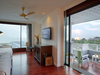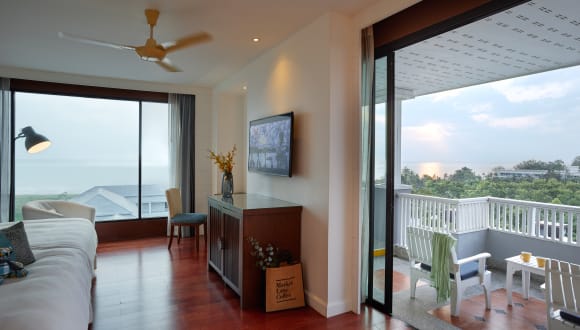 Deluxe Balcony (40-42Sq.M.) features 1 King+Daybed or 2 Queen size beds wooden floor, hard wood furniture, sofa, flat screen TV, DVD player free mini bar replenished daily, free tea/coffee making facility, big closet private safety box, beach bag, slipper and bath robe, private bathroom with shower and rain shower, big balcony with relaxing chairs Mini Suite Pool/Garden Balcony (52 Sq.M.) features Super King bed+Sofa bed or 2 Queen size bed + Sofa bed, accommodating up to 5 persons, good for family with kids wooden floor, hard wood furniture, sofa, flat screen TV, DVD payer, free mini bar replenished daily, free tea/coffee making facility, big closet private safety box, beach bag, slipper and bath robe, private bathroom with separate bath tub and shower with rain shower, big balcony adjacent to swimming pool or garden with relaxing chairs. Mini Suite Sea & Horizon Balcony (44-58 Sq.M.) features 1 King+Sofa bed or 2 Queen size beds wooden floor, hard wood furniture, sofa, flat screen TV, DVD player, free mini bar replenished daily, free tea/coffee making facility, big closet private safety box, beach bag, slipper and bath robe, private bathroom with shower and rain shower, big balcony with view of the gulf of Siam and its horizon as well as relaxing chairs