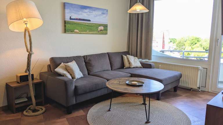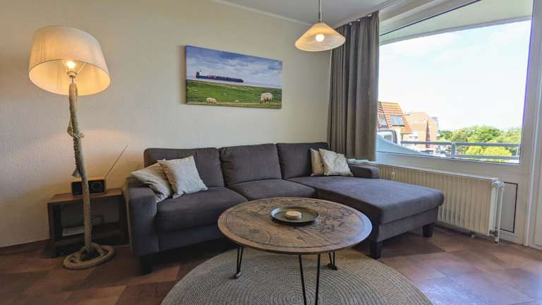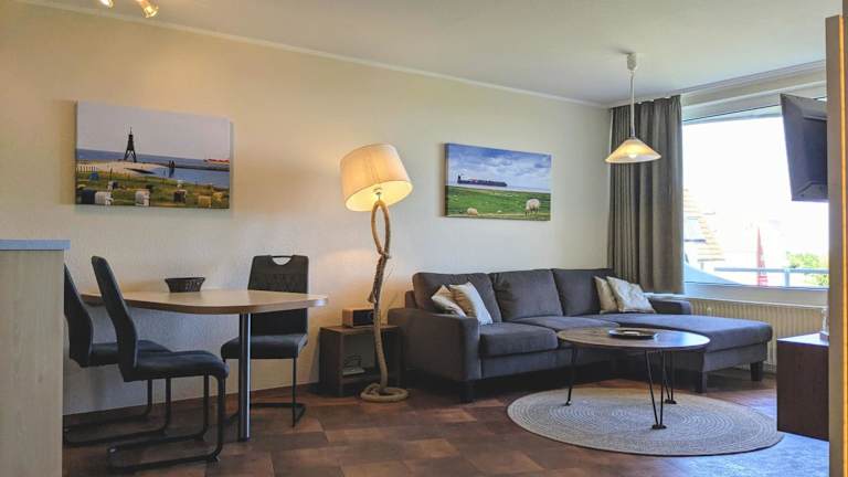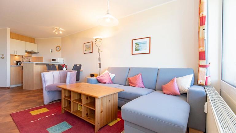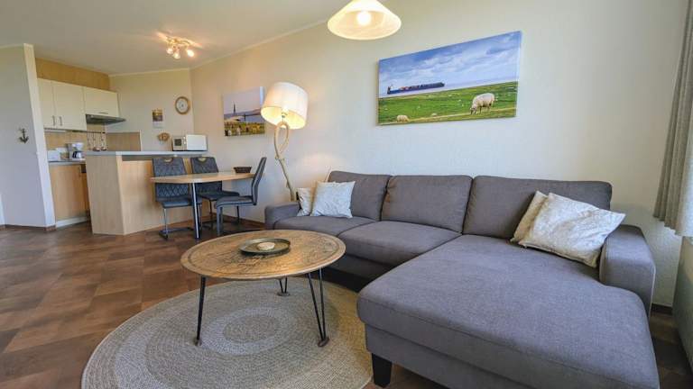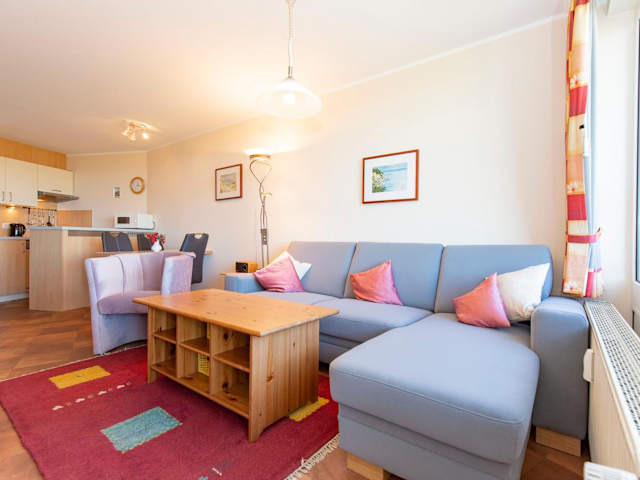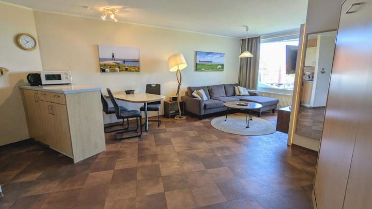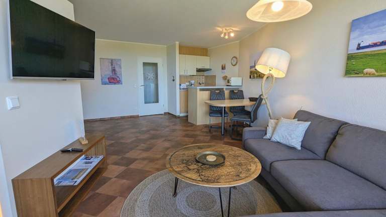 Die Ferienwohnung verfügt über ein Schlafzimmer und ein Wohnzimmer, ausgestattet mit einem TV. Die gut eingerichtete Küche beinhaltet einen Kühlschrank und einen Geschirrspüler. Ein Badezimmer mit Dusche ergänzt die Ausstattung. Zudem bietet die Wohnung einen Balkon mit Meerblick.