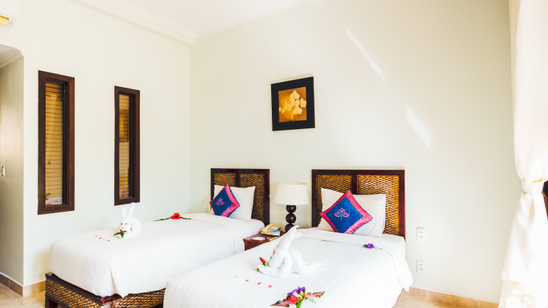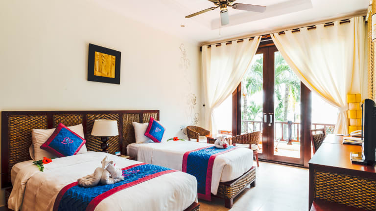 Lotus Muine Resort & Spa offers beachfront accommodations in Binh Thuan Province, just 4.3 mi from Phan Thiet City. The beautiful resort features a tropical outdoor pool, free parking and free Wi-Fi access throughout the property. Guestrooms at Muine Lotus Resort feature panoramic views of the ocean and Muine Beach. A flat-screen cable/satellite TV and personal safe are provided. Each room also comes with tea/coffee making facilities and a fridge. Guests can take a refreshing dip in the pool or indulge in relaxing massages at the spa. Afternoons can be spent at the sauna and the spa pool. Concierge and ticketing services are provided by the friendly staff. Free bicycle rental is also available. Local and international dishes are served at Lotus Muine Resort. Moon Beach Bar & Restaurant presents spectacular sunset views, exotic cocktails and refreshing desserts. Lotus Muine Resort is a short distance from Muine Tourist Center and Poshanu Cham Tower.