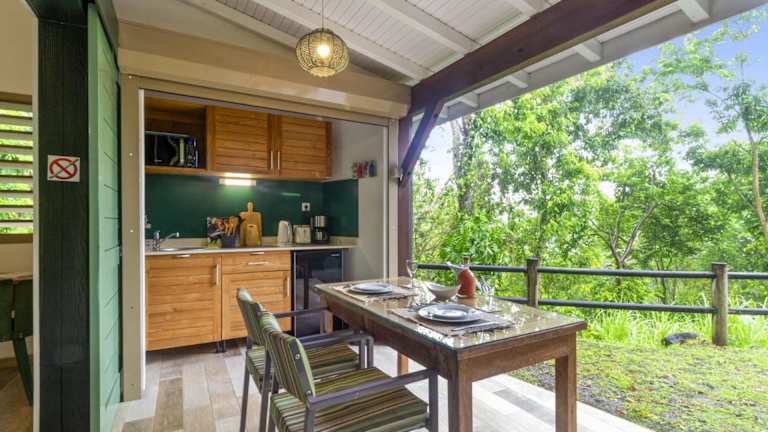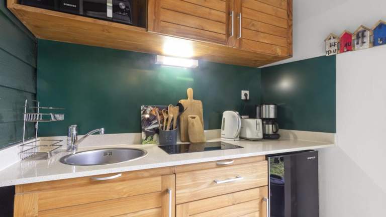 Das Ferienhaus bietet ein separates Schlafzimmer und eine voll ausgestattete Küche mit Kühlschrank und Ofen. Des Weiteren stehen ein Badezimmer sowie Handtücher und Bettwäsche zur Verfügung. Die Unterkunft ist klimatisiert.
