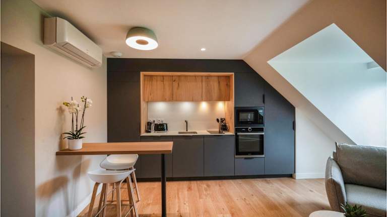 Das Apartment umfasst ein Schlafzimmer, ein Wohnzimmer sowie eine voll ausgestattete Küche mit einem Kühlschrank und einer Kaffeemaschine. Ferner findet sich ein Badezimmer mit Dusche und Haartrockner. Die Unterkunft ist klimatisiert und enthält Annehmlichkeiten wie Heizung und Rauchmelder.
