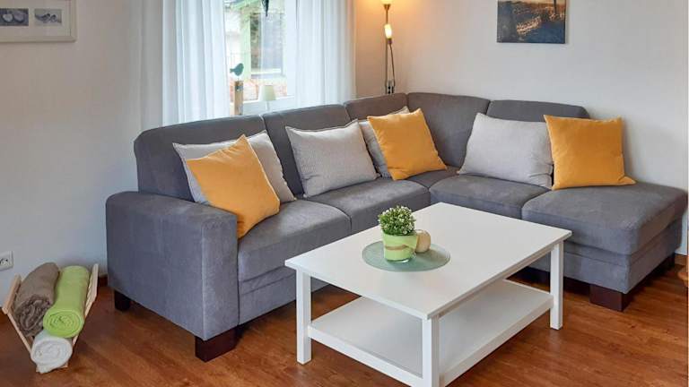 Die Ferienwohnung umfasst zwei Schlafzimmer, ein Wohnzimmer und eine gut ausgestattete Küche, ideal für Selbstversorger. Sie ist auf einem hohen Standard eingerichtet und bietet einen Balkon mit Meerblick.
