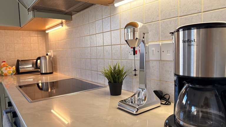 Das Ferienhaus umfasst zwei Schlafzimmer, ein Wohnzimmer, eine voll ausgestattete Küche mit Kühlschrank und Kaffeemaschine sowie ein Badezimmer mit Dusche und Whirlpool. Handtücher und Bettwäsche werden bereitgestellt.