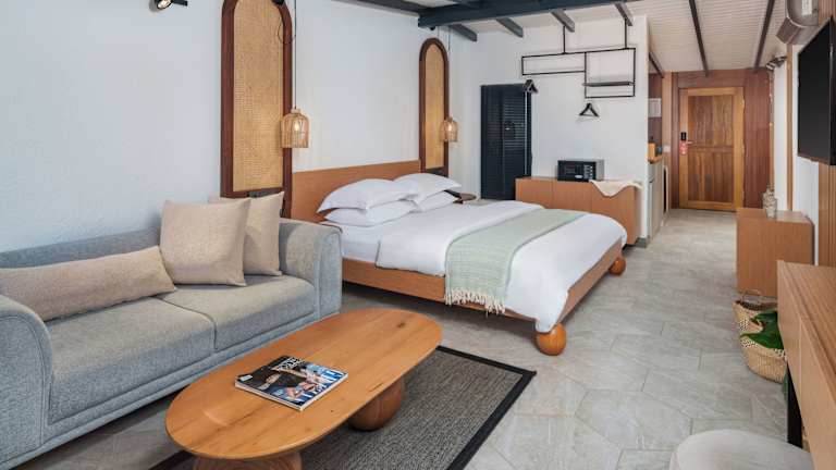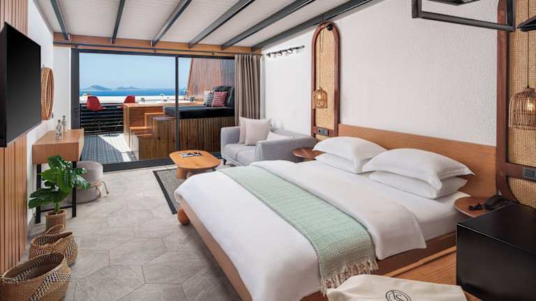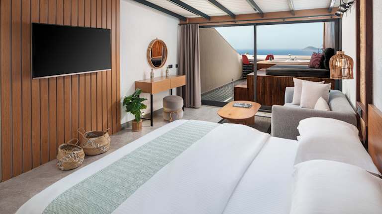Die Zimmer sind ausgestattet mit Klimaanlage, einem Sitzbereich, Flachbild-TV mit Satellitenkanälen, Küchenzeile, Essbereich, Safe und eigenem Badezimmer mit Dusche. Einige Zimmer verfügen über eine Terrasse oder Meerblick. Bettwäsche und Handtücher sind vorhanden.